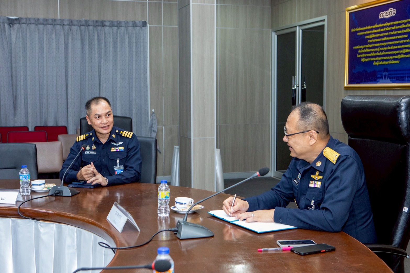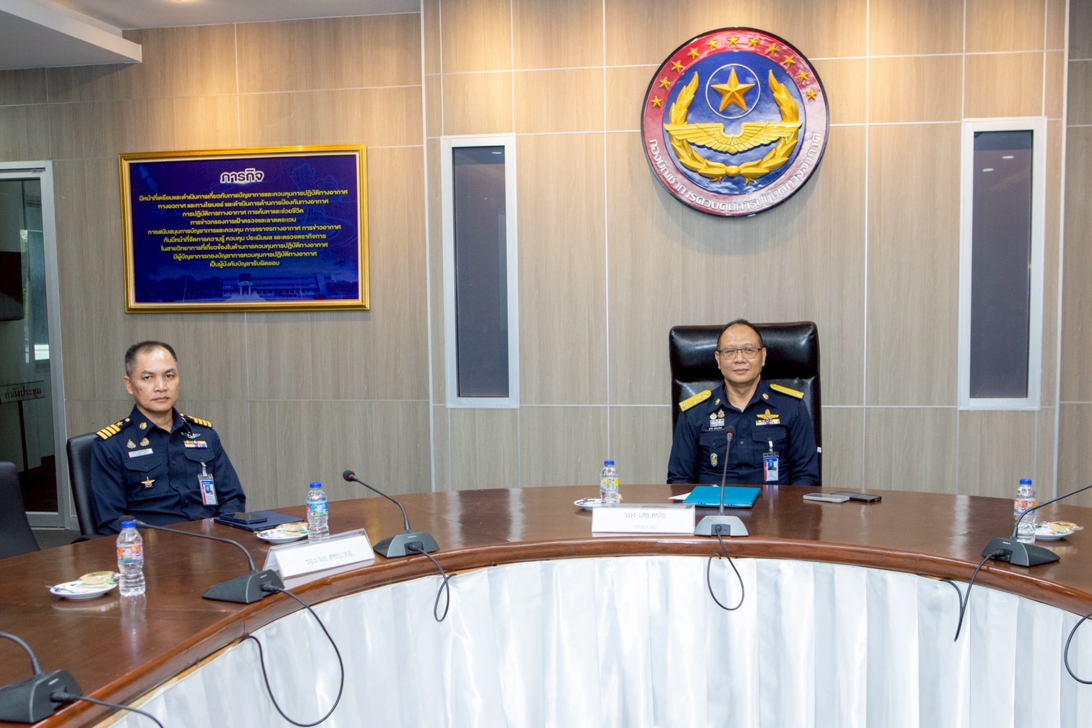 พลอากาศตรี จุมพล คล้อยภยันต์ รองเสนาธิการกองบัญชาการควบคุมการปฏิบัติทางอากาศ ให้การต้อนรับ นาวาอากาศเอก สหรัฐ เนตรประภา รองผู้อำนวยการศูนย์ไซเบอร์กองทัพอากาศ
