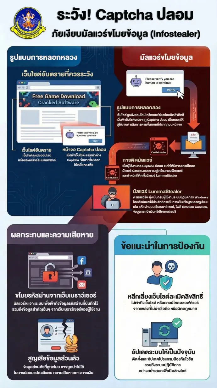 มีการดาวน์โหลดมัลแวร์ CastleLoader ลงสู่เครื่องคอมพิวเตอร์ และทำหน้าที่ติดตั้งมัลแวร์ LummaStealer ตัวมัลแวร์จะมุ่งเน้นกลุ่มผู้ใช้งานระบบปฏิบัติการ Windows