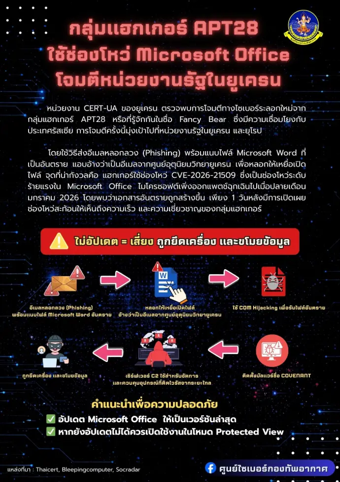 กลุ่มแฮกเกอร์ APT28 ใช้ช่องโหว่ Microsoft Officeโจมตีหน่วยงานรัฐในยูเครน โดยใช้วิธีส่งอีเมลหลอกลวง พร้อมแนบไฟล์ Microsoft Word ที่เป็นอันตราย แอบอ้างว่าเป็นอีเมลจากศูนย์อุตุนิยมวิทยายูเครน เพื่อหลอกให้เหยื่อเปิดไฟล์ แฮกเกอร์ใช้ช่องโหว่ CVE-2026-21509 ซึ่งเป็นช่องโหว่ระดับร้ายแรงใน Microsoft Office ไมโครซอฟต์เพิ่งออกแพตช์ฉุกเฉินไปเมื่อปลายเดือนมกราคม 2026 โดยพบว่าเอกสารอันตรายถูกสร้างขึ้นเพียง 1 วันหลังมีการเปิดเผยช่องโหว่สะท้อนให้เห็นถึงความเร็วและความเชี่ยวชาญของกลุ่มแฮกเกอร์ดังนั้น เพื่อความปลอดภัยของผู้ใช้งานระบบสารสนเทศทั้งภายในและภายนอกกองทัพอากาศ ศูนย์ไซเบอร์กองทัพอากาศจึงมีความประสงค์ให้ทุกท่านปฏิบัติตามระเบียบการใช้งานระบบสารสนเทศของกองทัพอากาศอย่างเคร่งครัด ดำเนินการอัปเดต Microsoft Office ให้เป็นเวอร์ชันล่าสุดหรือเปิดโหมด Protected View ในกรณีที่ยังไม่สามารถอัปเดตได้ เพื่อความปลอดภัยต่อข้อมูลส่วนบุคคลและข้อมูลของกองทัพอากาศ #ศูนย์ไซเบอร์กองทัพอากาศ#APT28 #ช่องโหว่ #MicrosoftOffice